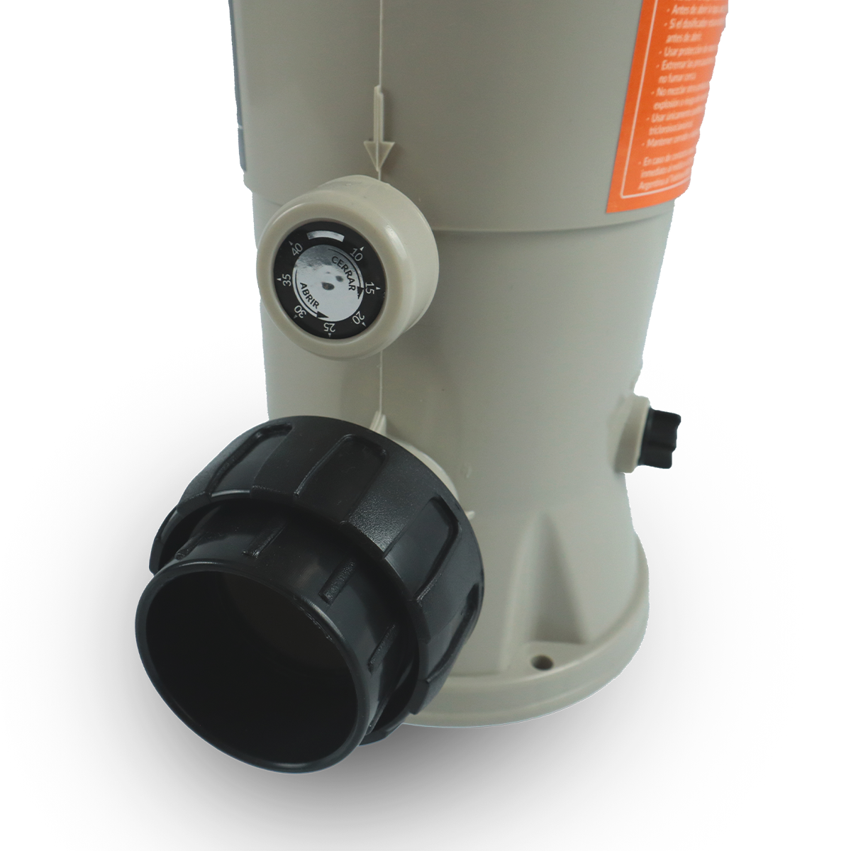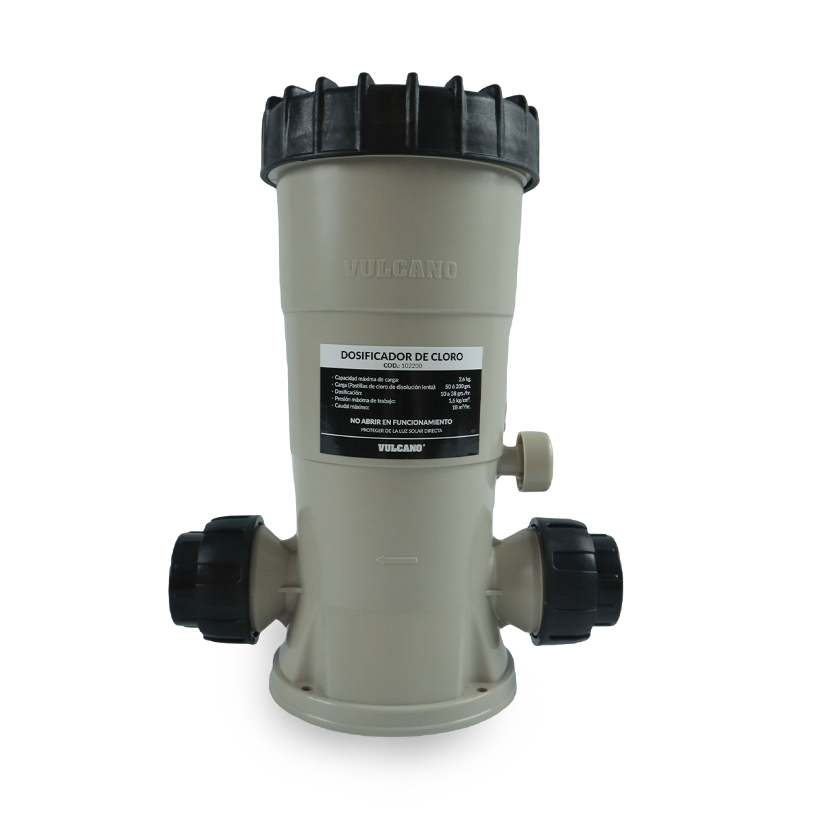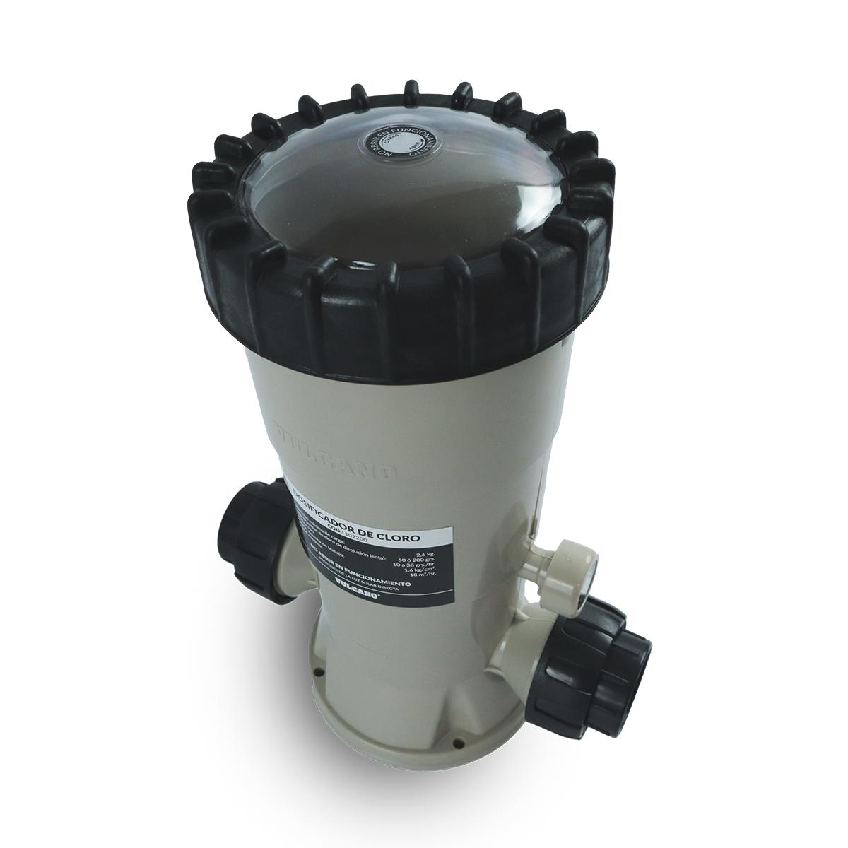 Dosificador de cloro Vulcano con capacidad de 2,6 kg de carga total, para pastillas de disolución lenta de 50 y 200 g. El equipo funciona en conjunto con el sistema de filtración de la piscina, conectado en línea al circuito de retorno, para dosificar el cloro durante varias semanas sin necesidad de recarga, logrando una dispersión uniforme a todo el volumen de agua.