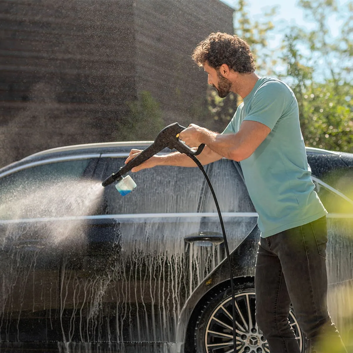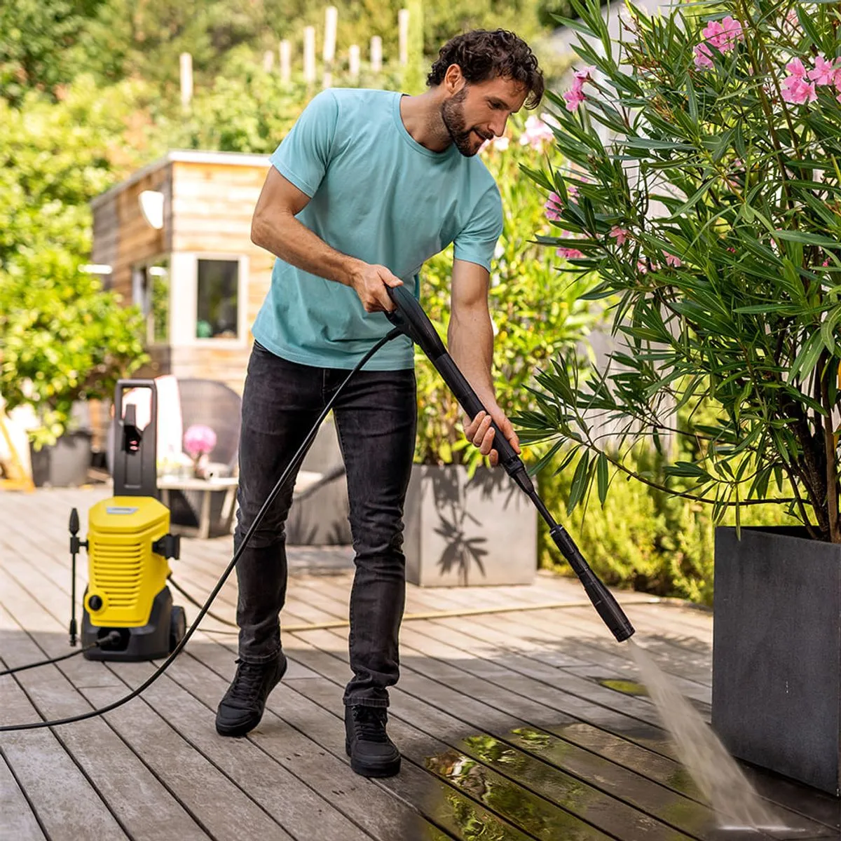 La Hidrolavadora K4 WCM convence por su potente motor refrigerado por agua, que se caracteriza por una larga vida útil. La hidrolavadora con manguera de alta presión de 6 metros fue creada para usos ocasionales y suciedad de intensidad media. Gracias a la lanza pulverizadora Vario Power y la boquilla turbo se limpian terrazas, muebles de jardín y vehículos según sea necesario. Con un sencillo giro, la presión del agua puede ajustarse con precisión en la lanza pulverizadora según el objeto que se tiene previsto limpiar. Además, la boquilla turbo con chorro concentrado giratorio brinda una limpieza perfecta, incluso en casos de suciedad incrustada. Todos los accesorios incluidos tienen un lugar de almacenamiento directamente en el equipo. El filtro de agua integrado protege la bomba de forma fiable frente a las partículas de suciedad.