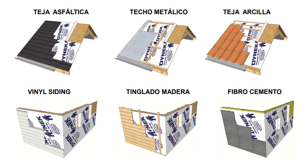 Envolvente en Muros. Se emplea previo a colocación de muros cortina, sidings y otros revestimientos. Envolvente en Techos con Pendientes > 20%.