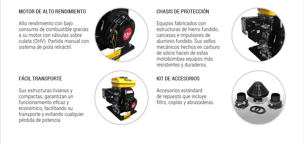 Conexiones Estándar: Diámetro de succión y descarga de 1,5″ x 1,5″ para una fácil conexión a sus sistemas de mangueras.
