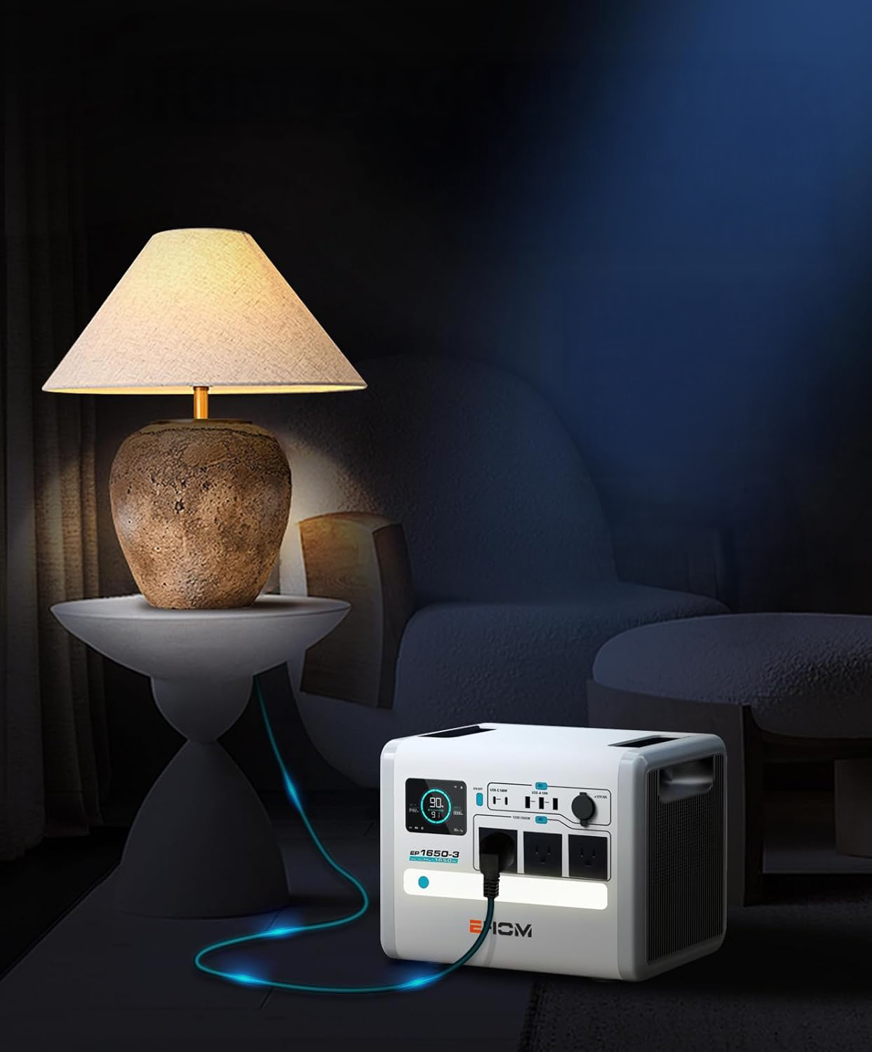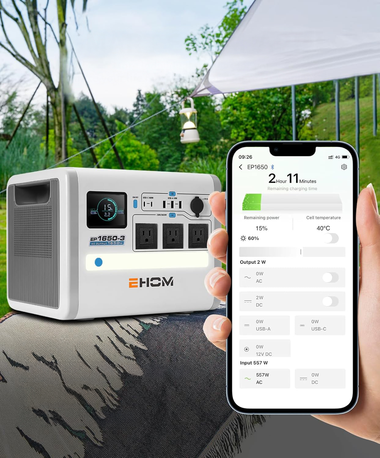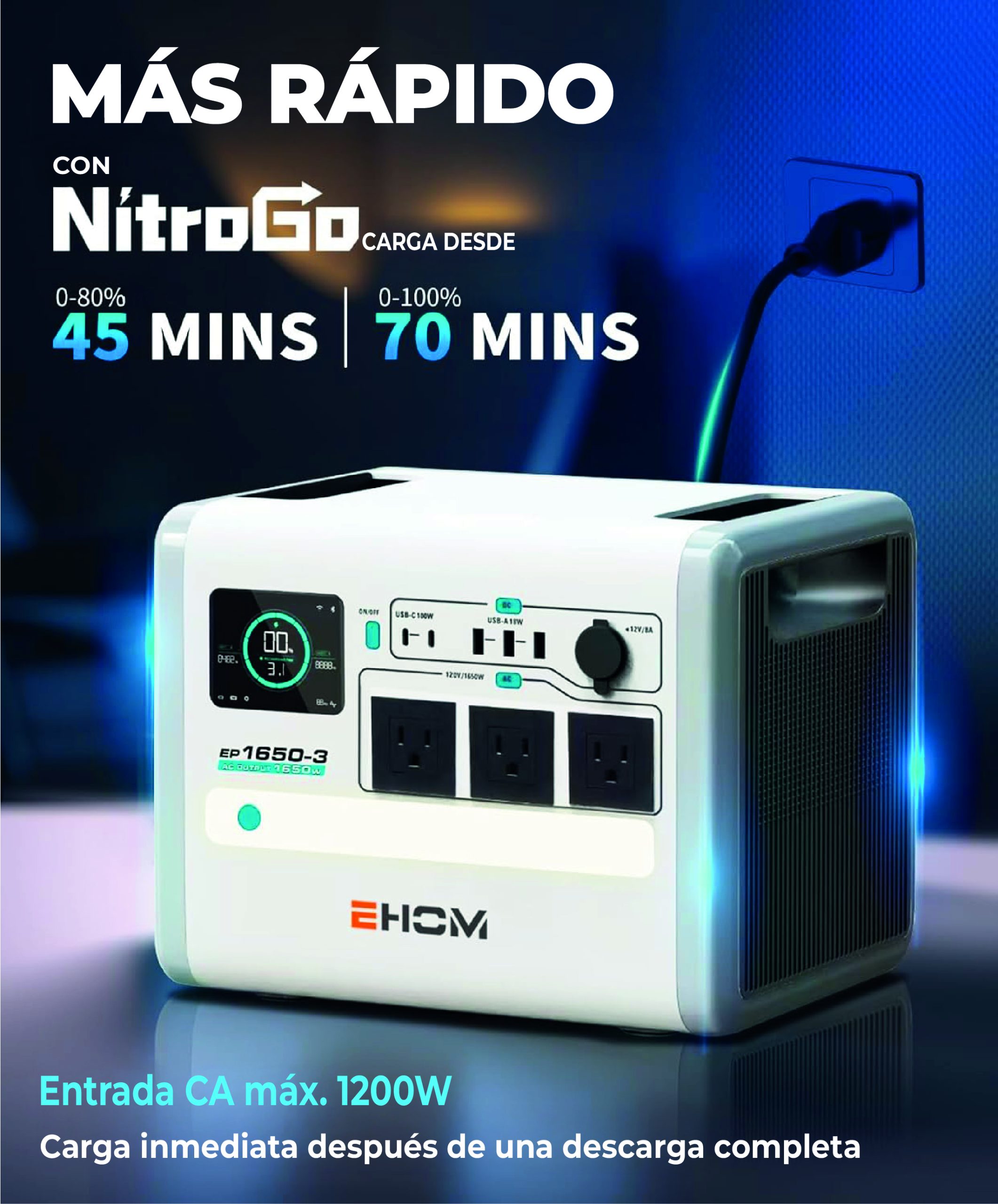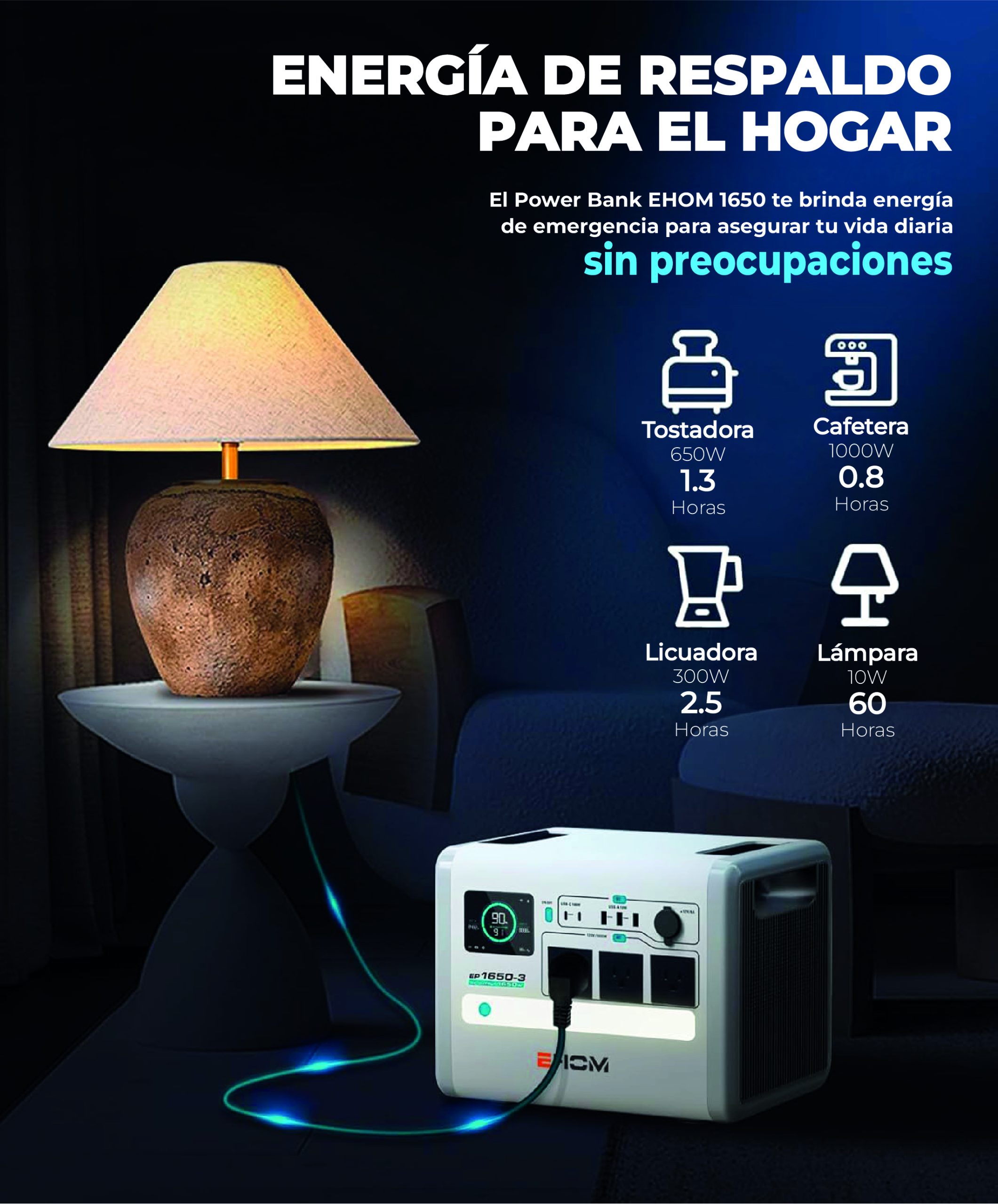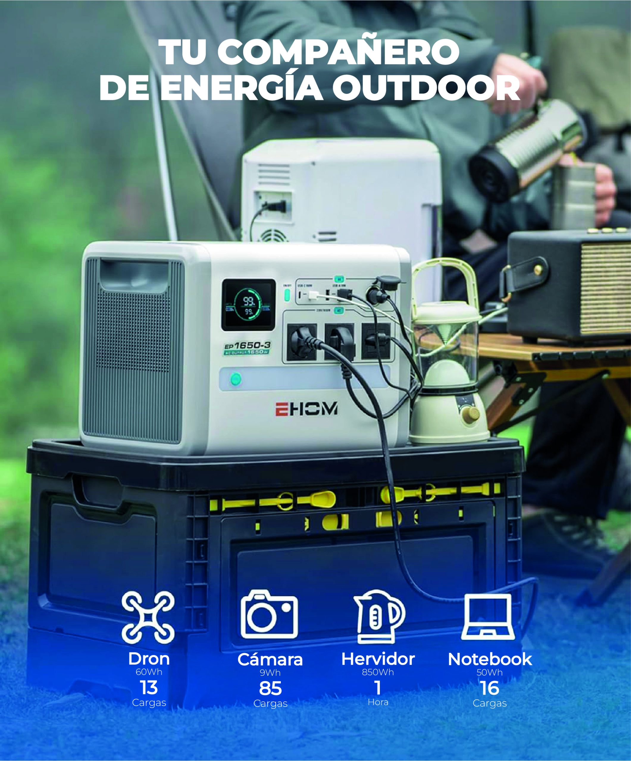Libera tu energía con la estación de energía portátil EHOM EP1650. Diseñada para ofrecer una solución robusta y confiable, esta central de 1650W de potencia continua (pico de 2200W) y una capacidad de 1024Wh es ideal para profesionales, entusiastas del aire libre y como respaldo en el hogar durante emergencias.